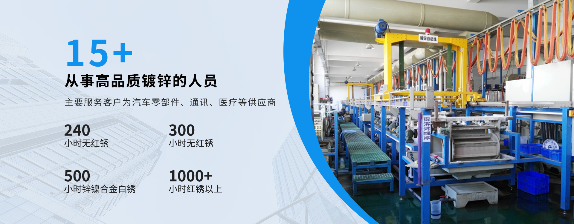 公司品質定位為高耐蝕性鍍鋅及鋅鎳合金產品,主要服務客戶為汽車零部件、通訊、醫療等供(gòng)應商,其(qí)三價鉻彩鋅(xīn)、藍白鋅鹽霧測試可達96小時(shí)無(wú)白鏽,240小時(shí)無紅鏽,三價鉻黑鋅可達120小時無白鏽,300小時無紅……